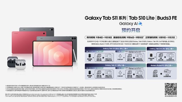 9月4日,三星Galaxy Tab S11系列、Galaxy Tab S10 Lite与Galaxy Buds3 FE三款新品于国内正式开启预约,并于9月19日全渠道正式开售。用户可前往三星商城、三星京东自营官方旗舰店、天猫三星官方旗舰店、抖音三星官网旗舰店等线上渠道以及线下授权三星门店参与活动进行购买,届时可享受惊喜购机福利。