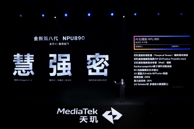 天玑 9400 所搭载的第八代 AI 处理器 NPU 890 亮点颇多。它率先于在移动 SoC 中支持“时域张量硬件指令加速”,大幅提升时间序列任务处理效率,让手机的使用流畅度与响应速度显著提升。与此同时,结合 “端侧高画质 DiT” 技术,天玑 9400 开创性地达成行业领先的端侧视频生成,无论是内容创作者,还是普通用户,都能借此享受更高效、私密的 AI 创作过程,且减少了对网络及外部算力的依赖。面对复杂多任务场景,天玑 9400 首发 “端侧混合专家 MoE 模型”,并率先支持端侧 LoRA 训练,使得智能手机能精准洞察用户需求。