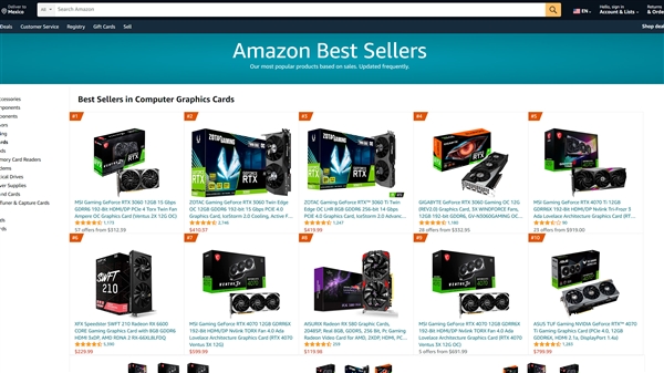 美国亚马逊上,显卡销量TOP10里已经有三款RTX 4070,但是卖得最好的一款也只是排第七,前边有RTX 3060、RTX 3060 Ti、RX 6600、RTX 4070 Ti。