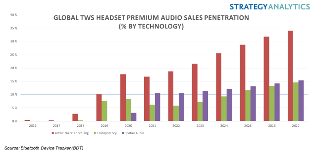 蓝牙TWS耳机的销量正在迅速增长。Strategy Analytics指出,2022年,全球TWS耳机出货量将同比增长38%。音频质量,尤其是主动降噪、透明模式和空间音频是最受欢迎的特性。防水和无线充电功能也十分受欢迎。特色差异化是厂商在日益拥挤的细分市场中脱颖而出的关键。(来源:Strategy Analysis)