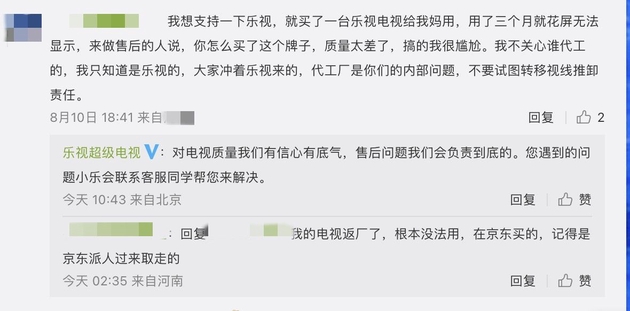 “我不关心谁代工的,我只知道是乐视的,大家冲着乐视来的,代工厂是你们的内部问题,不要试图转移视线推卸责任。”对于乐视的公开表态,有消费者表示支持乐视维权,也有人并不买帐。