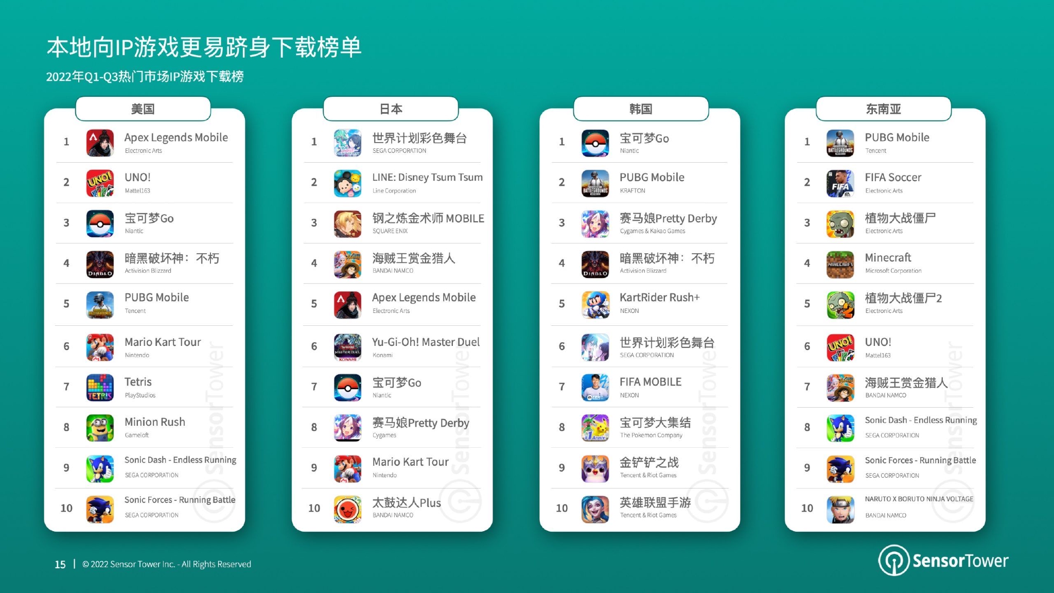 下载榜单中,《PUBG Mobile》继续蝉联下载榜榜首。EA旗下《FIFA Soccer》在2022年前3个季度再度发力,成功跻身下载榜第2位;榜单第3名则由Mattel163发行的桌游《UNO!》获得。