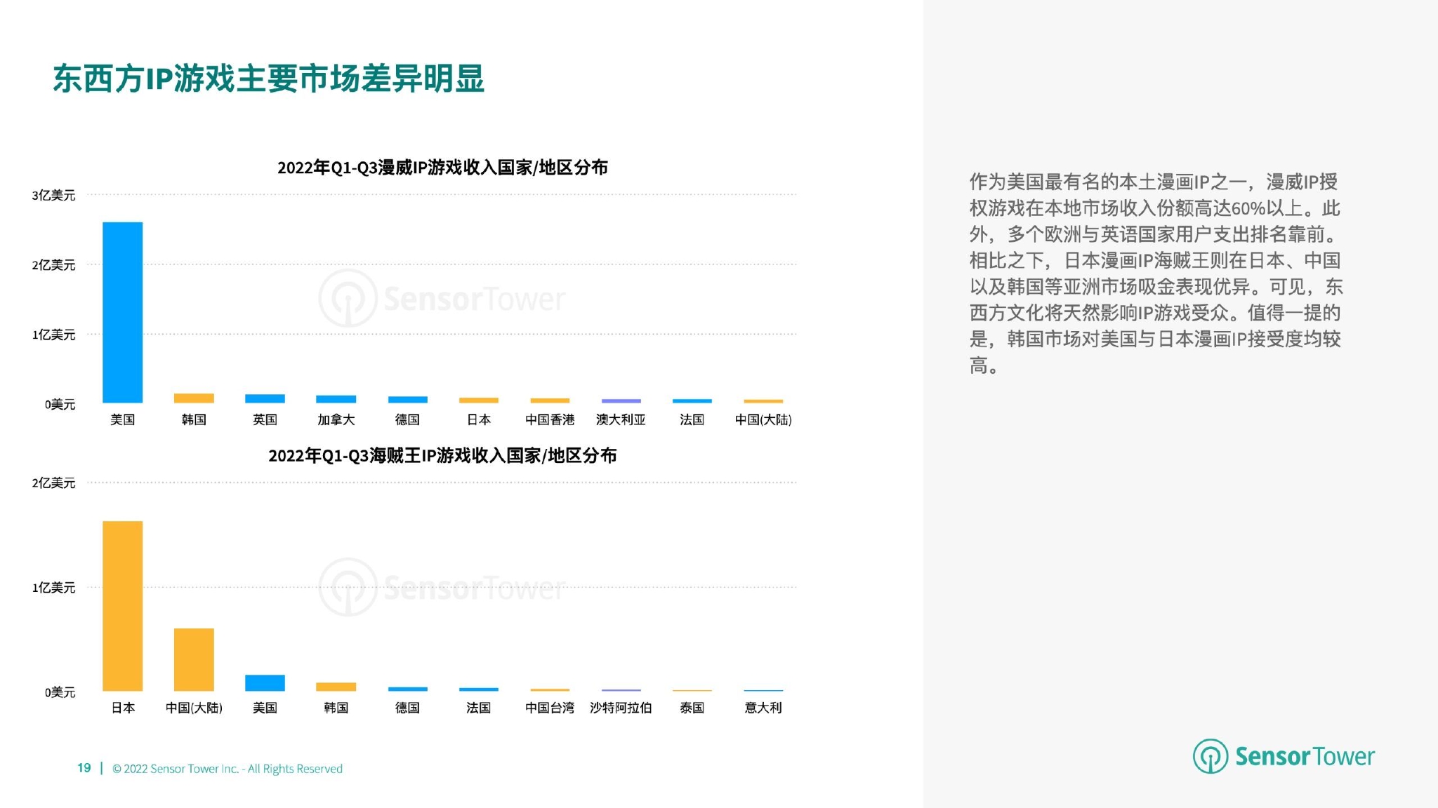依靠海量的本地游戏、动漫IP储备,日本以72亿美元的成绩成为2021年移动IP游戏收入最高的市场。美国同样拥有大量原创IP资源,因此用户对于相关IP游戏的付费意愿也较为良好。尽管美国游戏市场IP主要来源于本土影视剧、美漫以及小说,但近年来日本IP出海美国已颇具成效,例如超级玛丽、宝可梦以及七龙珠。