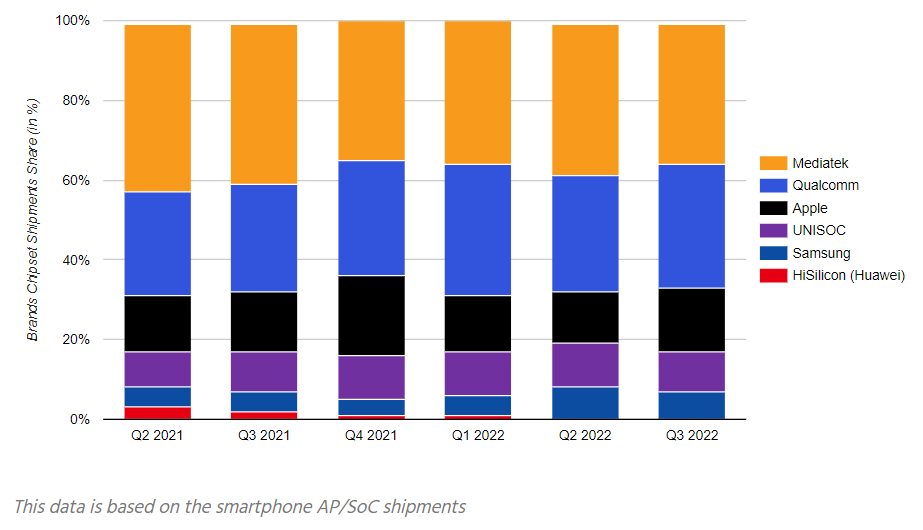 市场研究公司Counterpoint Research近日公布了2022年第三季度全球智能手机AP(应用处理器)市场报告。