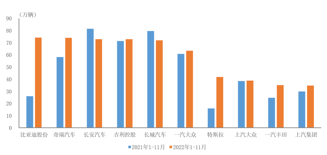 在上述十家企业中,与上年同期相比,长安汽车、长城汽车销量有所下降,其他企业均呈不同程度增长,其中比亚迪股份、特斯拉增速更为明显。