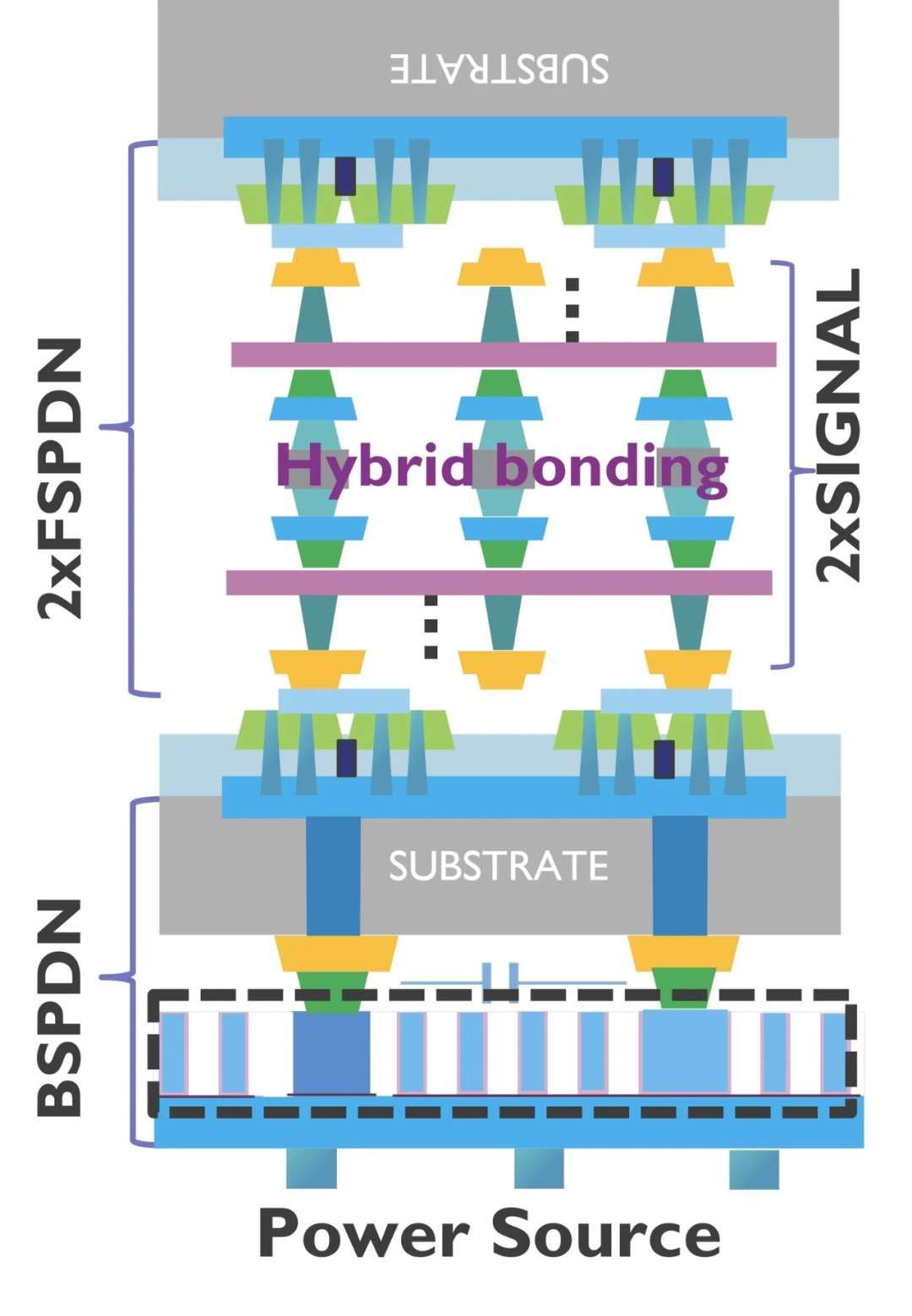 研究人员测试了这样一个场景:将一个带有背面供电网络的 CPU(底部为灰色)与另一个带有前端供电网络的 CPU(顶部为灰色)相连接。