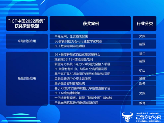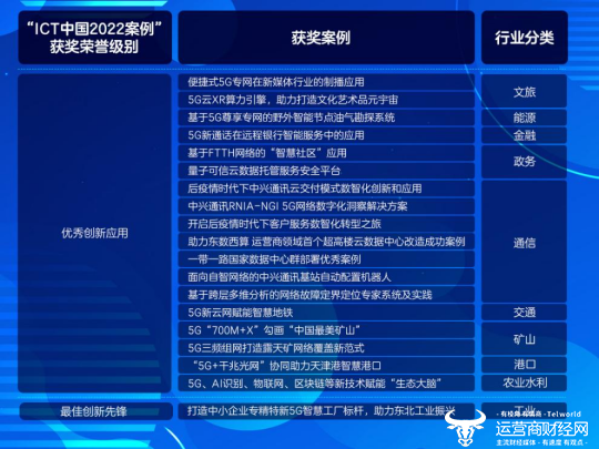 2022年12月15日,中国通信企业协会负责的“ICT中国(2022)案例征集及发布”活动获奖名单揭榜,旨在表彰ICT技术在垂直行业、跨界应用、新型智慧城市、数字化转型建设方面的优秀案例等。中兴通讯凭借为全球电信运营商、行业客户等提供创新的技术与产品解决方案,荣获大赛“优秀组织奖”1项,“优秀创新应用案例”奖共计33项,分别为“卓越创新应用案例”奖3项,“最 佳创新应用案例”奖11项,“优秀创新应用案例”奖18项,“最 佳创新先锋”奖1项,覆盖政务、工业、能源、教育、通信等领域。