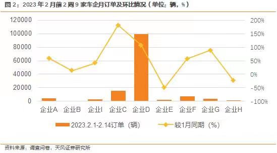 从天风证券近期跟踪的产销数据来看,2月前2周9家车企共计交付10-11万辆,5家车企交付量的环比增速高于整体水平。预计2023年2月9家车企2月交付量有望在24-25万辆,相比1月环比将增长41%-46%。