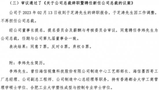 当日,海信视像也发布公告称,于芝涛不再担任公司总裁,同意聘任李炜为公司总裁。