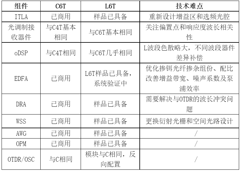图3 多波段光传输系统基本架构目前C+L相关产业链的发展情况如表2所示。可以看出,随着技术难点的攻克,C+L扩展波段光器件供应链的发展进度符合预期,新一代C6T+L6T的12THz宽频光层配合单波400G QPSK光系统有望在1年内迎来商用部署。