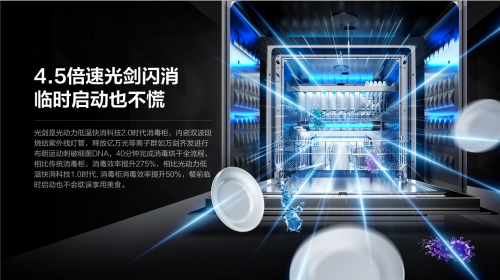 在最新推出的光剑消毒柜XS827上搭载了光动力低温快消科技,机身顶部和背部搭载双涡旋速烘技术,配合电热加热管,输出中低温环绕式循环热风,平均烘干温度只有50℃,这使得宝贝的奶瓶、牙胶等等这些重要的小物件都不会被高温灼伤,从此可以放心消毒了。且消毒烘干全流程只需40分钟,远低于120-180分钟的高温消毒和90-150分钟的臭氧+紫外线消毒,这使得大多数家庭在烹饪前临时启动消毒柜,也不会耽误享用美食。
