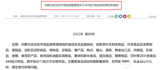 详细来讲,2022年年12月16日,内蒙古自治区市场监督管理局发布了关于444批次食品抽检情况的通告,其中巴彦淖尔市万客乐超市团结店销售的,安琪酵母股份有限公司全资子公司安琪酵母(赤峰)有限公司生产的优级绵白糖,干燥失重不符合产品明示质量要求,检验结果为0.388g/100g,标准值为0.8-2g/100g。