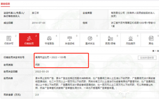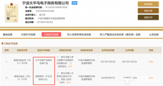 值得一提的是,在国家企业信用信息公示系统中显示,宁波太平鸟电子商务有限公司还不止一次被罚,该公司2020年曾因虚假宣传被罚5万,2021年还因销售不合格莫代尔抹胸内衣被罚款1580元等。