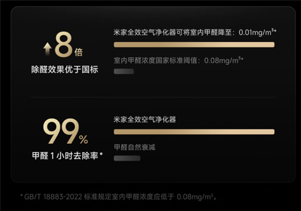 该净化器1小时除醛率为99%,甲醛CADR值390m³/h,可将室内甲醛降至0.01mg/m³,除醛效果优于国标8倍。