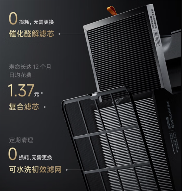耗材方面,米家全效空气净化器只有复合滤芯需要更换,售价499元,建议使用寿命12个月,差不多每天约1.37元,而催化醛解滤芯和可水洗初效滤网则无需更换,后者定期清理即可。