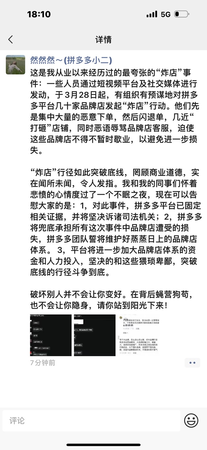 3月29日,针对近期拼多多平台数十家品牌店遭遇有组织的“炸店”事件,有拼多多小二发布朋友圈称,这是从业以来经历过的最夸张的恶意打砸店铺事件,平台已固定相关证据,并将坚决诉诸司法机关。