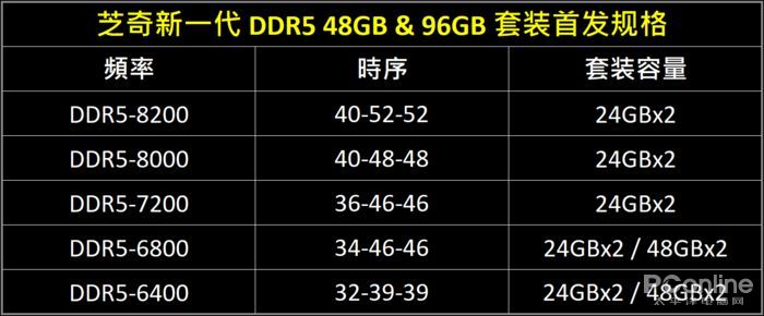 芝奇全新48GB&96GB套装规格下表为芝奇新推出的多款48GB(2x24GB)及96GB(2x48GB)套装规格表: