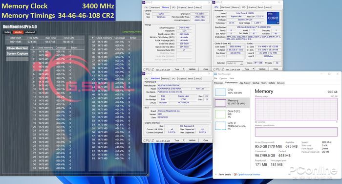 除了上述DDR5-8200的超高频率48GB套装,芝奇为满足大容量内存爱好者的需求,也成功将96GB(2x48GB)的超大容量套装速度推向新高,发表DDR5-6800CL34-46-4696GB(2x48GB)的梦幻产品,并已在第13代Intel®Core™i9-13900K处理器及ASUSROGMAXIMUSZ790Hero主板通过烧机测试,以下为测试截图: