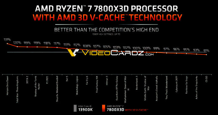 从VideoCardz拿到的PPT来看,R7 7800X3D在1080p分辨率和高画质的21款游戏中平均领先幅度仅有6.9%,在像《地平线:零之曙光》这样的3A游戏中最大性能领先幅度能达到31%,在《CS:GO》中反而要落后9%。但从整个测试结果来看,R7 7800X3D整体领先还是比较明显的,考虑到价格差距可以说R7 7800X3D在性价比上可以说是更胜一筹。