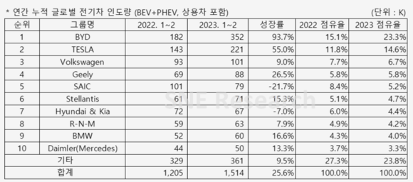 数据显示,1-2月全球各国登记的新能源汽车数量约为151.4万辆,同比增长25.6%。市场份额第一至第三名分别是比亚迪(23.3%)、特斯拉(14.6%)和大众(6.7%),韩国现代起亚汽车以4.4%排在第7位。按增长率计算,排名前三的车企分别为比亚迪(93.7%)、特斯拉(55%)和吉利(26.5%)。