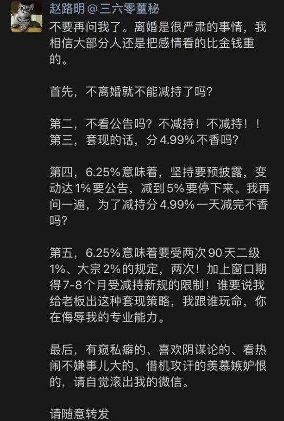 周鸿祎与胡欢离婚公布后,市场对这桩离婚的原因众说纷纭,究竟是周鸿祎平衡不好家庭与事业才离婚,还是“假离婚真减持”?三六零董秘赵路明4日晚间在朋友圈力挺老板,并怒怼称:离婚是一件很严肃的事,谁要说我给老板出这种套现策略,我跟谁玩命,你在侮辱我的专业能力。如果为了套现,分4.99%不香吗?