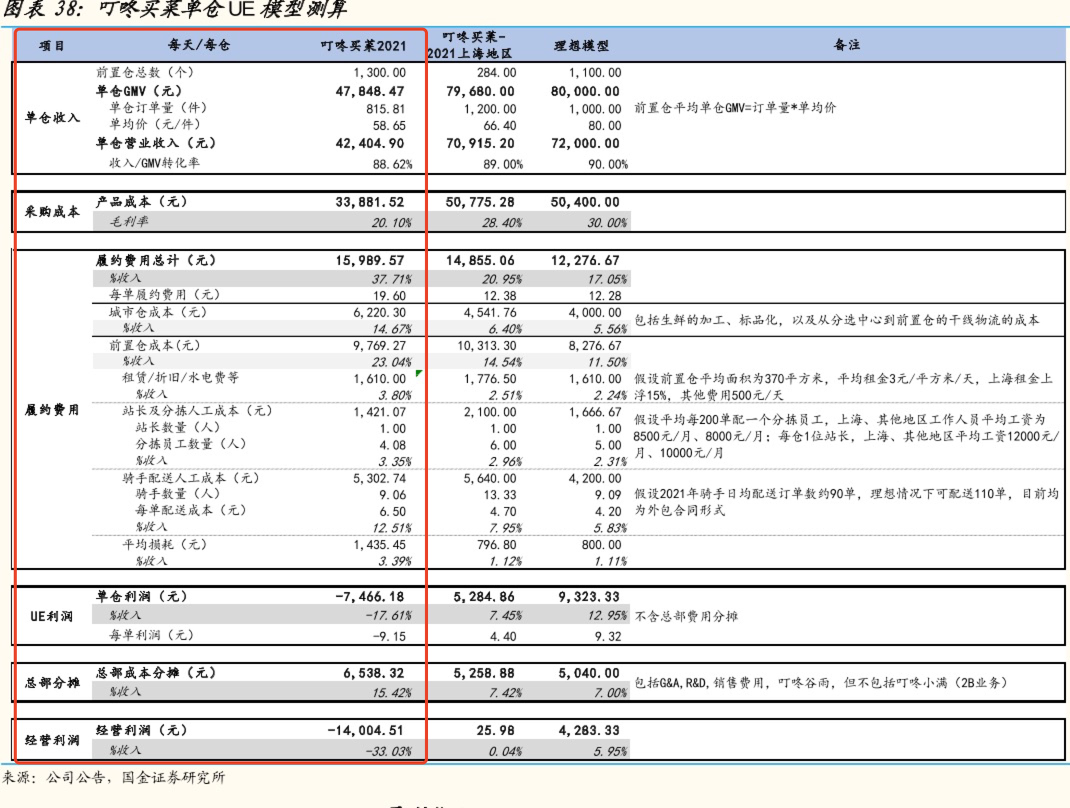 之前有券商对叮咚买菜的单仓模型做过测算,商品本身成本81.8%,大仓、前置仓、分拣物流加水电折旧的费用占比22.4%,配送的人工费用15%,再加上销售6.9%,这么算下来,即使一个前置仓每天一千单,客单价60元,也会净亏26%。
