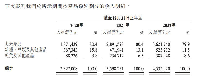 这促成了今天十月稻田的营收表——招股书显示,2019-2022年,十月稻田连续四年成为中国预包装东北大米零售市场收入最大的公司,后三年的营收分别为23.27亿元、35.98亿元和45.33亿元,复合年增长率为39.6%。同期,十月稻田的经调整净利润分别为2.21亿元、2.59亿元和3.64亿元。