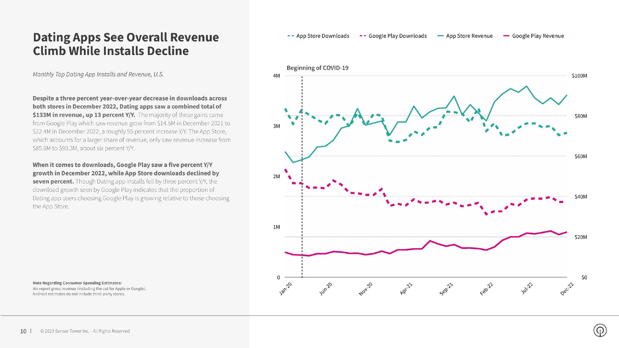 2022年第四季度,约会和社交发现应用的安装量为1890万次,同比下降11%。年度安装量为7730万,同比下降7%。