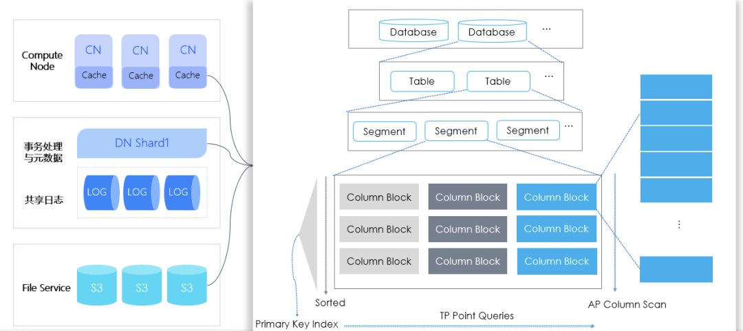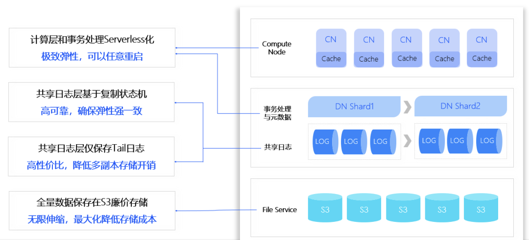 冷热分离 ,使用File Service以S3对象存储作为目标,每个计算节点都有自己的Cache。