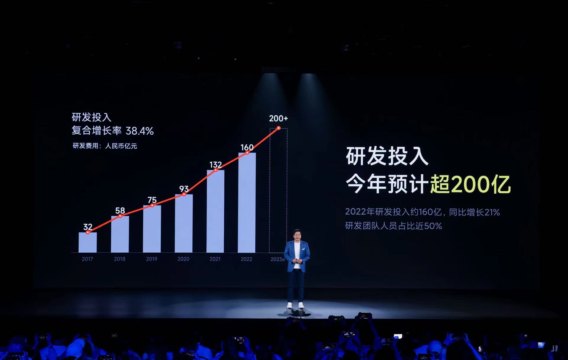 雷军表示,小米将继续坚持“技术为本”,持续不断加大研发投入,今年的研发投入预计超过200亿元。在过去五年中,小米研发投入的年复合增长率达到38.4%,目前研发人员占比近五成。