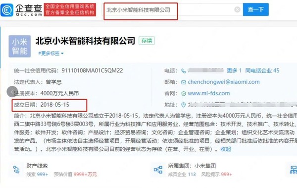企查查显示,北京小米智能科技有限公司成立于2018年5月,注册资本为4000万元人民币,由小米通讯技术有限公司全资控股,经营范围包含:技术开发、技术推广、技术转让、技术咨询、技术服务;计算机系统服务;基础软件服务、应用软件服务等。