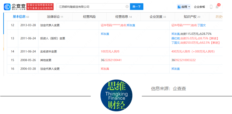根据企查查资料,江西银利隆锻造有限公司是金利隆实际控制人郑友直曾经直接参股的企业,郑友直于2011年出资115万元获得银利隆28.75%的股份,后于2016年4月7日将持有的银利隆锻造28.75%的全部股权转让给时任公司副总经理葛献民,退出股东的行列。