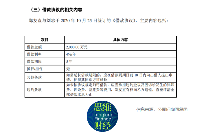 深交所就刘志为何没有通过员工持股平台入股而是直接入股的方式进行问询。公司回复称刘志长年负责公司的内销业务,为公司的发展壮大做出了突出贡献,出于对其历史贡献的考虑,同意刘志以直接持股的方式入股。值得注意的是,刘志的增资款系通过郑友直“资助”而得。2020年10月25日郑友直向刘志提供借款2000万元,同时约定以每年4%的利息借款5年。