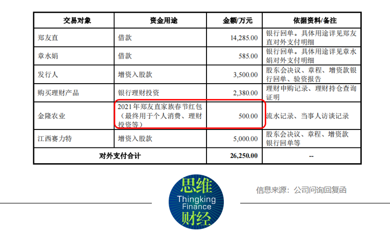 值得一提的是,根据公司回复交易所的资金用途表,2020年分红过后的春节,郑友直大手笔的将500万现金用于家族春节红包,可见其“阔绰”。而发放红包的主体同样为江西鑫鑫,发放对象金隆农业则是郑友直、章水娟及其子郑刚、郑强一家四口完全控制的公司。