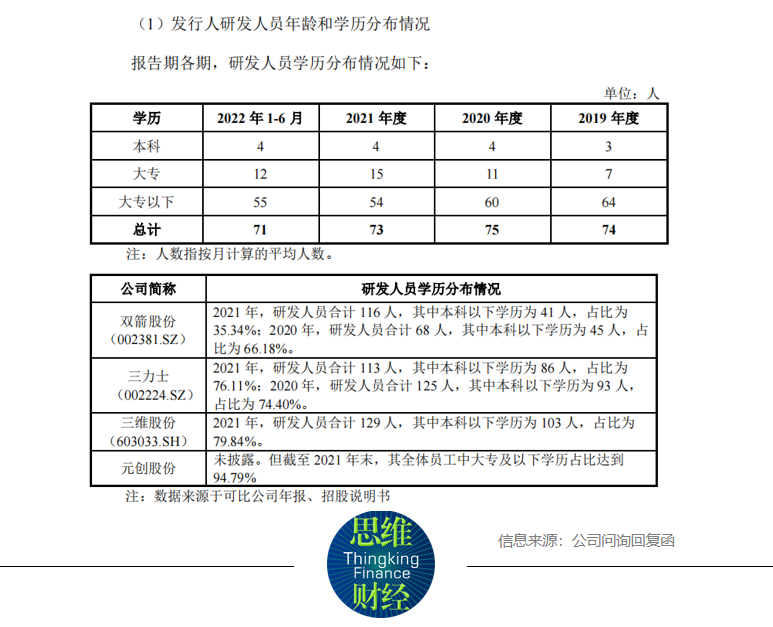 翻看上述上市公司对应的2021年年报,双箭股份(002381.SZ)截止2021年末,研发人员共116人,其中本科人数为61人,同时拥有6名硕士;三力士(002224.SZ)本科研发人员14人,同时拥有11名硕士和2名博士;三维股份(603033.SH)有本科研发人员22名和4名硕士研发人员。同行公司均拥有硕博的研发团队,而金利隆研发队伍最高学历为本科,且仅3至4人,如此对比下,何以得出不存在显著差异?