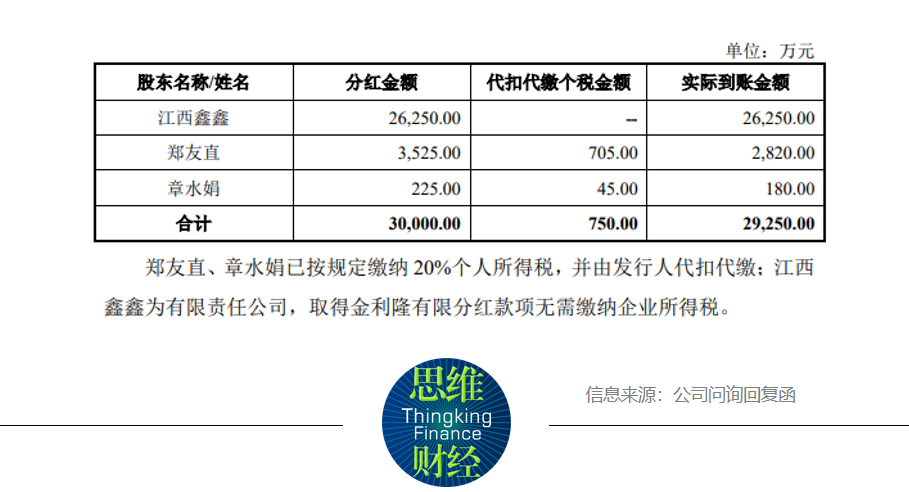 江西鑫鑫设立于2010年,由金利隆实控人郑友直和其妻章水娟完全控制。然而在江西鑫鑫突然入股的5天后,金利隆于2020年11月10日通过股东会决议,同意将截至2020年10月30日的未分配利润为基数,根据股东认缴比例分配现金红利30,000万元。彼时公司股权由郑友直夫妻及其二子100%完全控制,上述大额分红均落入了实际控制人一家四口的口袋。