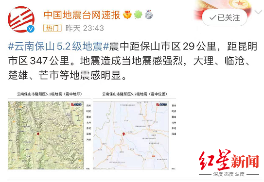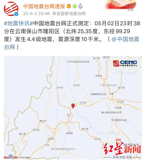 2023年5月2日23时27分,云南保山市隆阳区附近(北纬25.3度、东经99.3度)发生5.2级左右地震,10分钟后,又发生4.4级地震。据人民日报报道,云南大理、临沧、楚雄、芒市等多地有震感。