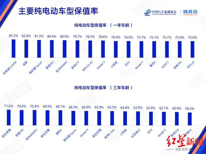 保值率跌幅较低的纯电动车型有保时捷Taycan、五菱宏光MINIEV、比亚迪汉EV、零跑T03、奇瑞小蚂蚁、哪吒V等。其中零跑T03跌幅最小,一年车龄与三年车龄二手车的保值率只相差5.2个百分点。