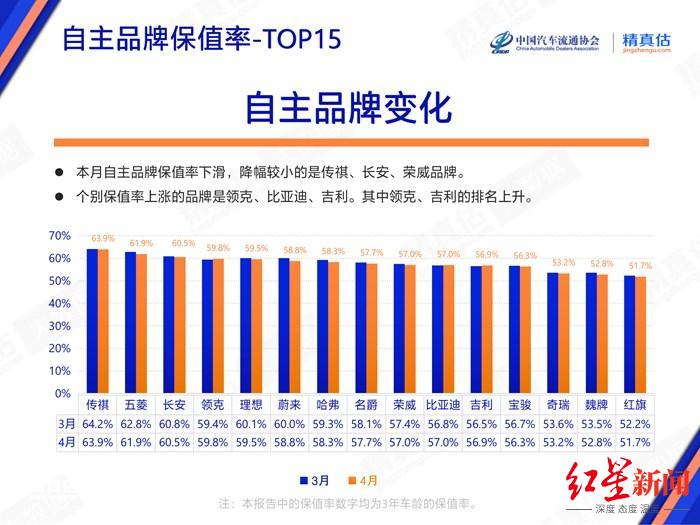 自主品牌的二手车保值率也在下滑,其中长安(000625.SZ)、传祺、荣威降幅较小,领克、比亚迪(002594.SZ)、吉利(00175.HK)的保值率上升。从4月的二手车保值率来看,仅传祺、五菱、长安的保值率在60%以上,分别为63.9%、61.9%和60.5%。