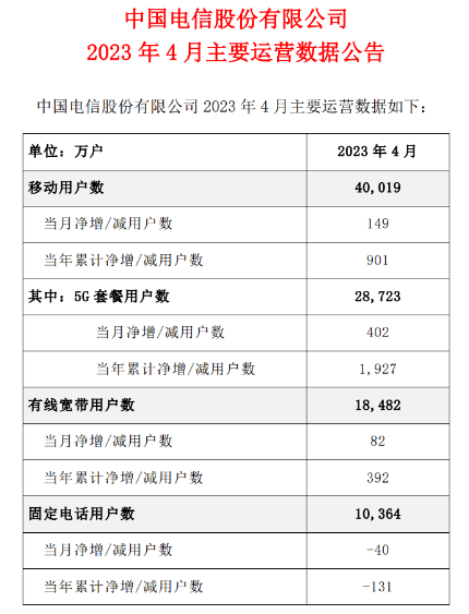 中国电信4月份运营数据显示,当月,5G套餐用户数净增402万户,累计达到2.8723亿户。当月,中国电信移动客户数净增149万户,用户总数达到4.0019亿户。有线宽带业务方面,4月客户数净增402万户,累计达到1.8482亿户。固定电话用户数方面,4月净减40万户,累计达到1.0364亿户。5G用户渗透率接近72%。