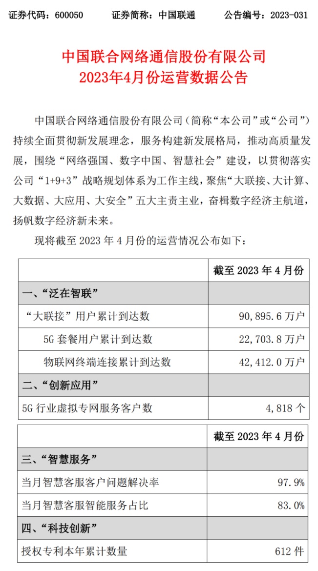 中国联通2023年4月运营数据显示,中国联通5G套餐用户累计达2.27亿户。物联网连接达到4.24亿户,大连接用户总数达到9.09亿户。