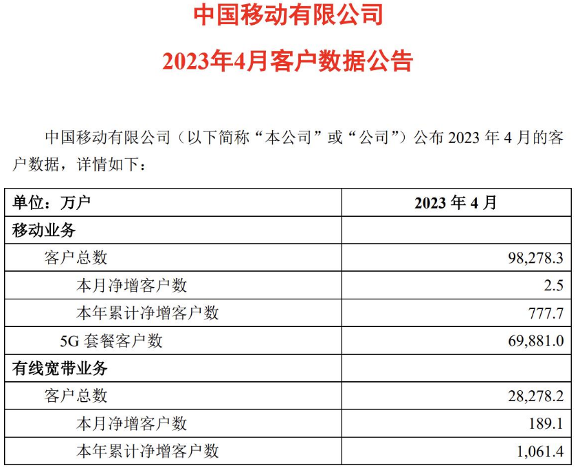 中国移动公布2023年4月份运营数据显示,5G套餐客户数累计达到6.9881亿户。当月,中国移动移动客户数净增2.5万户,用户总数达到9.82783亿户。此外,有线宽带业务方面,4月客户数净增189.1万户,累计达到2.82782亿户。5G用户渗透率超过70%。