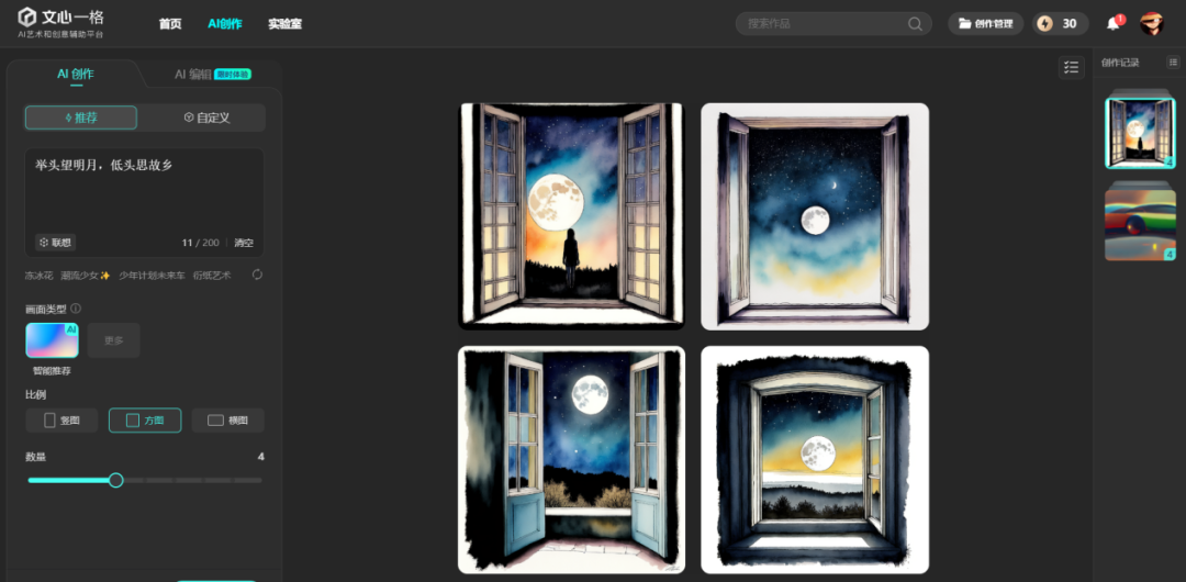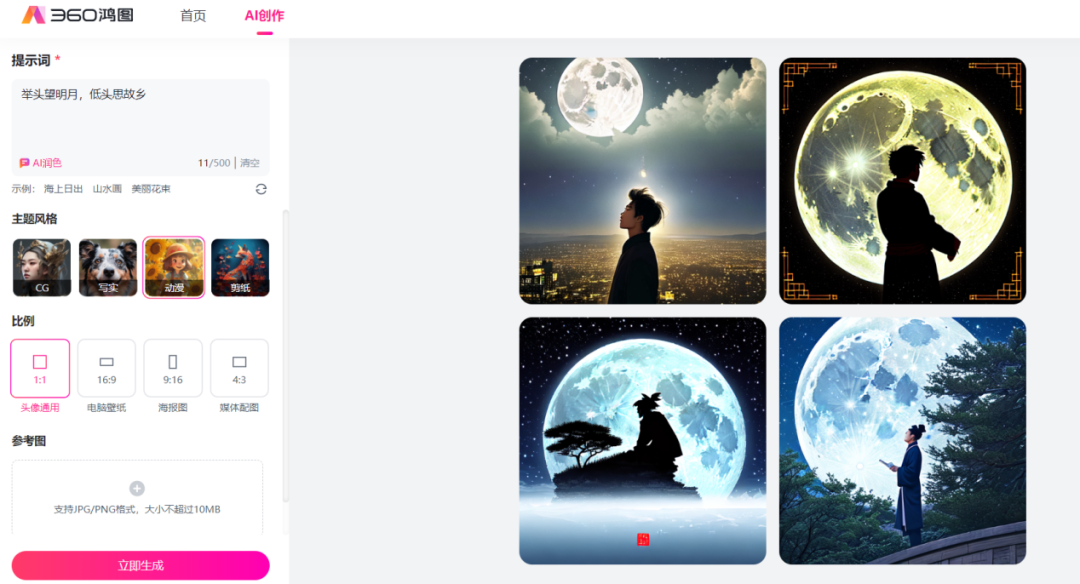 使用方式非常简单,在提示词对话框中输入你的关键词,系统就能生成目标内容。我试了试唐诗经典名句,李白的《静夜思》中的「举头望明月,低头思故乡」,没想到「360 鸿图」结果还不错,反而是文心一格的答案没有那么贴切。