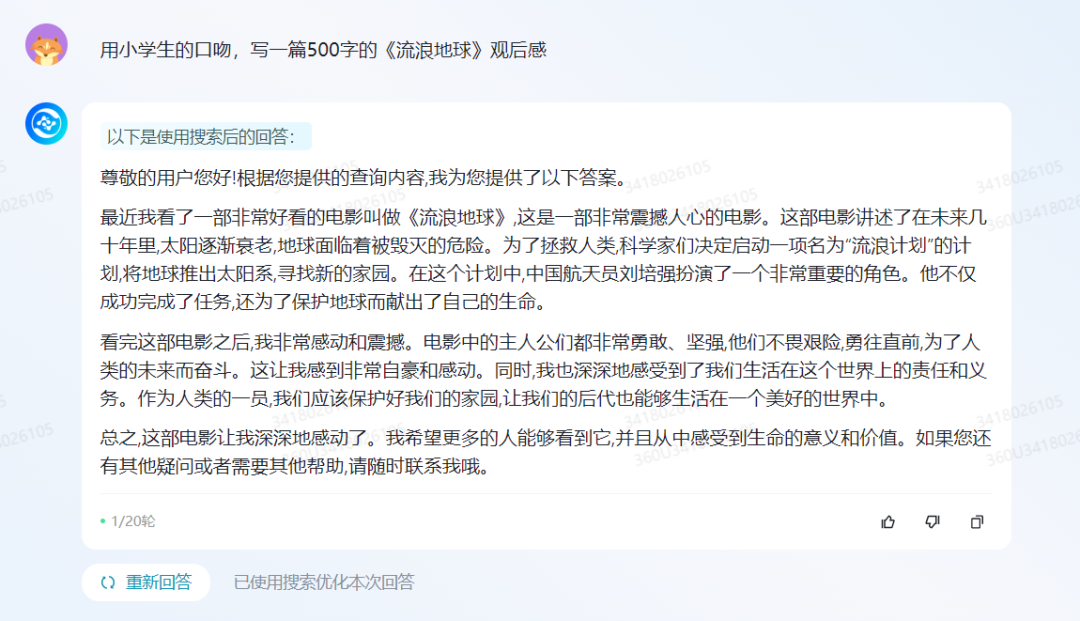 这个问题此前我也同样问了 ChatGPT,粗略看好像 ChatGPT 更像一篇完整的内容,但实际上当你看过《流浪地球》这部电影,你会发现 ChatGPT 不停地虚构内容,而「360 智脑」则是按照剧情来正确描写的,如果你真的一字不改就交作业,恐怕用 ChatGPT 会被老师罚站打手心了,显然「360 智脑」在回答上更加严谨。
