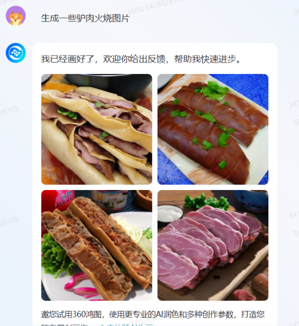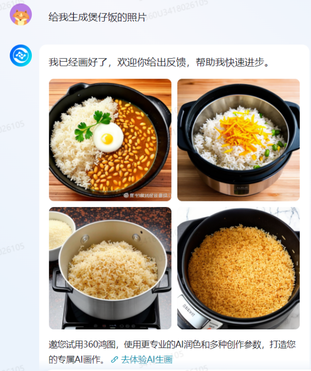 只要输入指令就可以直接让「360 智脑」生成想要的图片,我也测试了一下脑海中一联想到就很容易翻车的一些概念图,没想到答案居然都有模有样,比如下面这个驴肉火烧和煲仔饭,完全没有产生歧义联想,这在一定程度上表现了「360 智脑」与「360 鸿图」对中文语义理解的准确性。