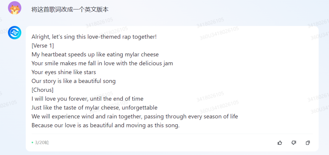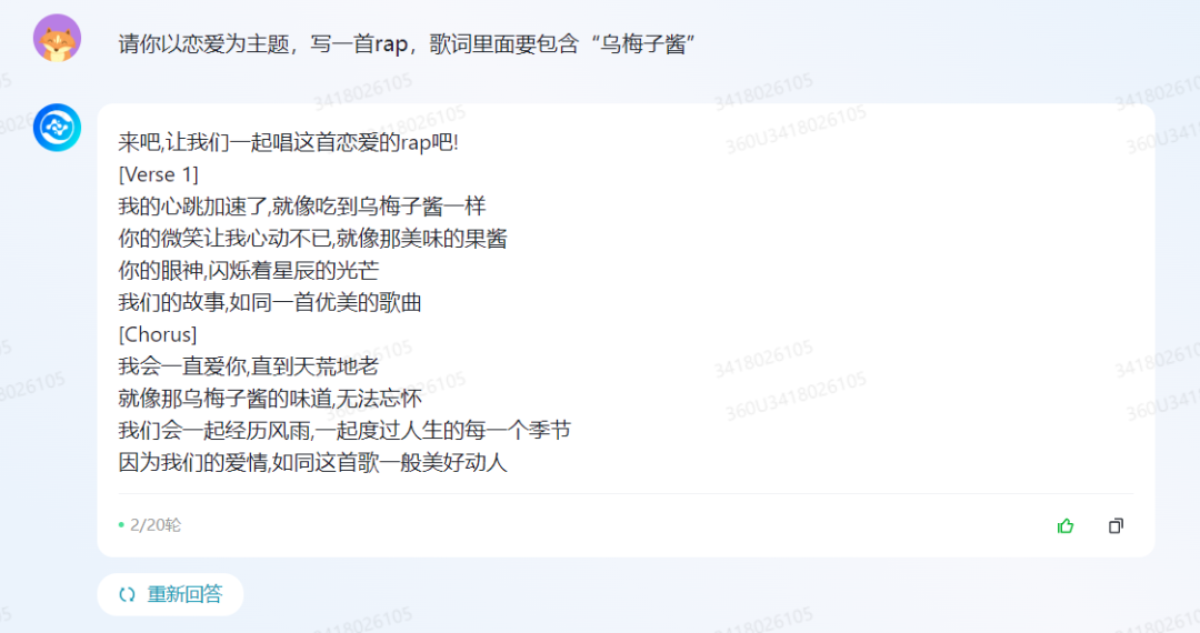 再或者我特别感兴趣的流行音乐,我试着让「360 智脑」以恋爱为主题,写一首 rap,歌词里面要包含「乌梅子酱」,没想到它的答案还挺有韵律。