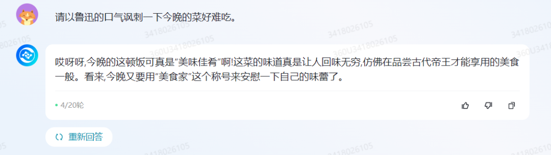 对了,还有模仿能力,当我让「360 智脑」模仿鲁迅地口吻来描写菜很难吃这个意思时,它的描写也非常有趣。