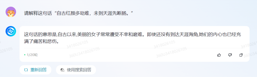 接下来,我打算尝试这个 AI 对于中国传统文化的理解和运用,比如当我问到「自古红颜多劫难,未到天涯先断肠」这句来自电影《绣春刀》中的句子什么意思时,给出了让人满意的答案。