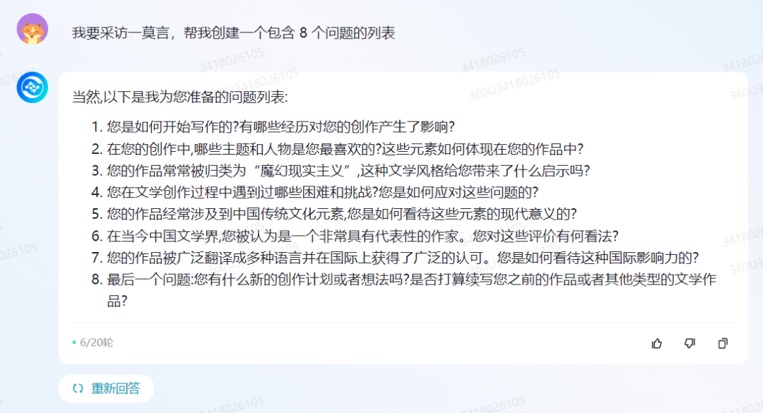 再比如下面这个,作为一名记者,如果我想采访著名作家莫言,帮我列出 8 个采访问题,「360 智脑」给出的回答也很丰富且有深度。