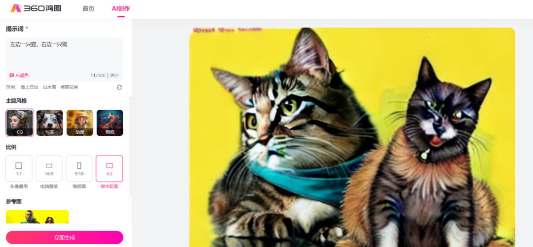 对了,除了关键词,你还可以找到一些参考图「喂」给「360 鸿图」,让它按照更具体的要求生成图片,从而产生更好的绘图结果,比如当我喂给 AI 一张《赛博朋克 2077》的宣传图,尝试让它生成我想要的猫狗图片,结果是它理解了我的意思,将人物替换成了猫狗,画面细节也很丰富。